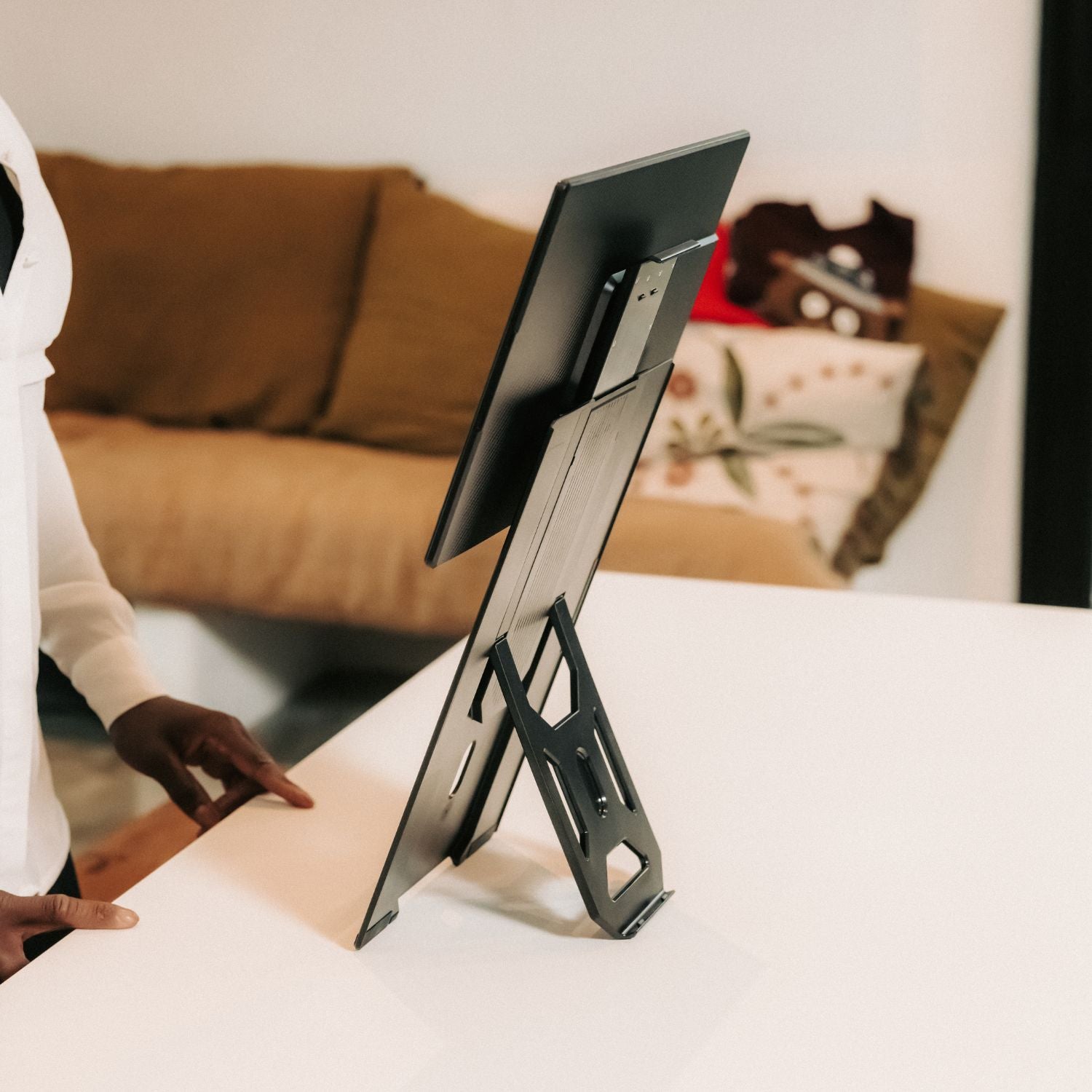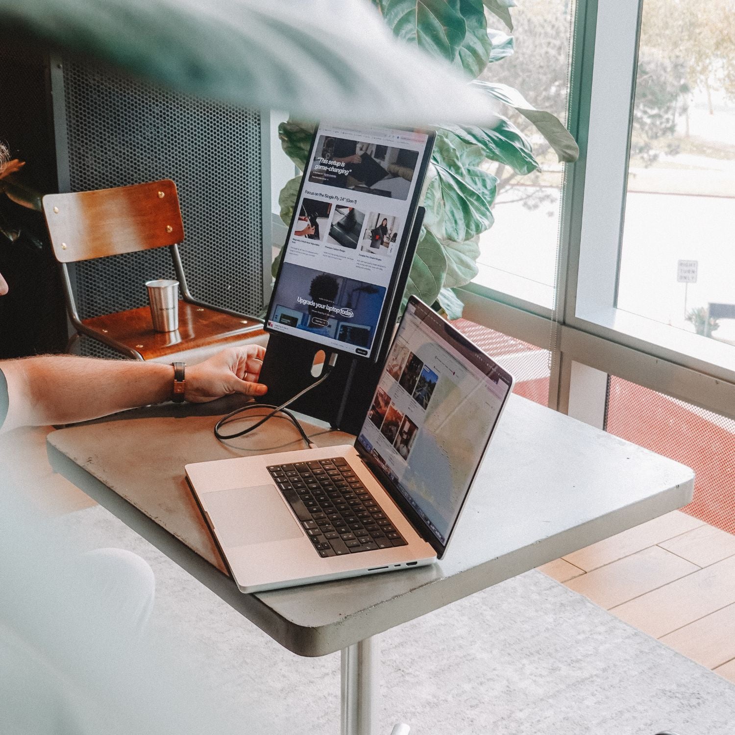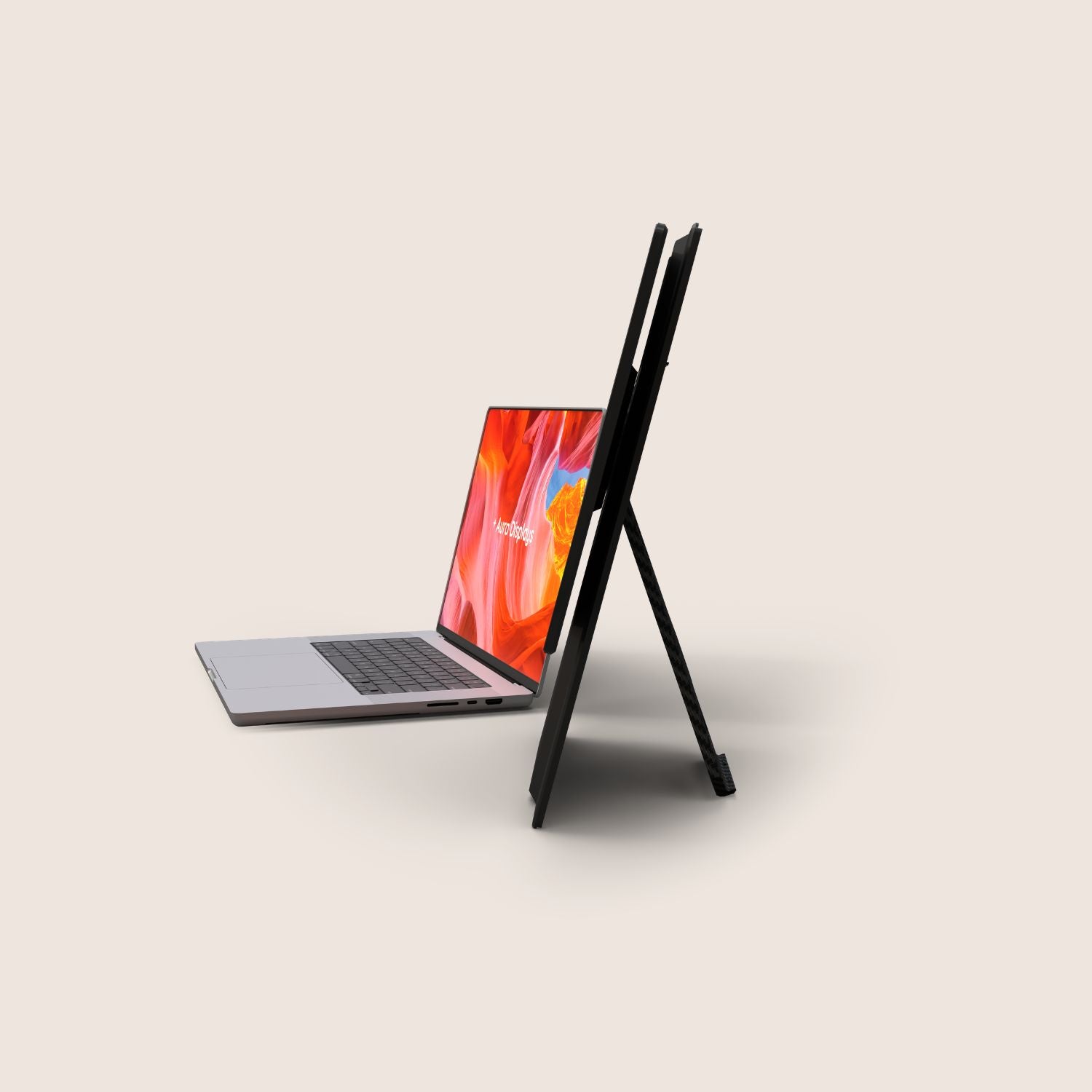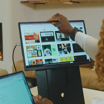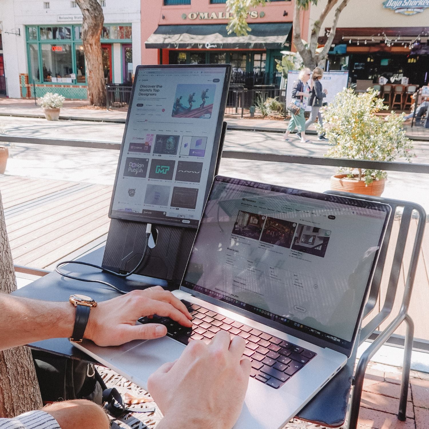 Introducing the Single Fly, the elevated portable monitor engineered for true desktop experience. Despite its expansive size, it is crafted to be impossibly lightweight and hyper slim, powered by a single, streamlined USB-C connection. The display seamlessly pivots from landscape to portrait mode, instantly optimizing it for any workflow. Its innovative design instantly and securely elevates the screen to eye-level. The Single Fly is the definitive solution for nomad professionals demanding a large portable screen for performance without compromise.