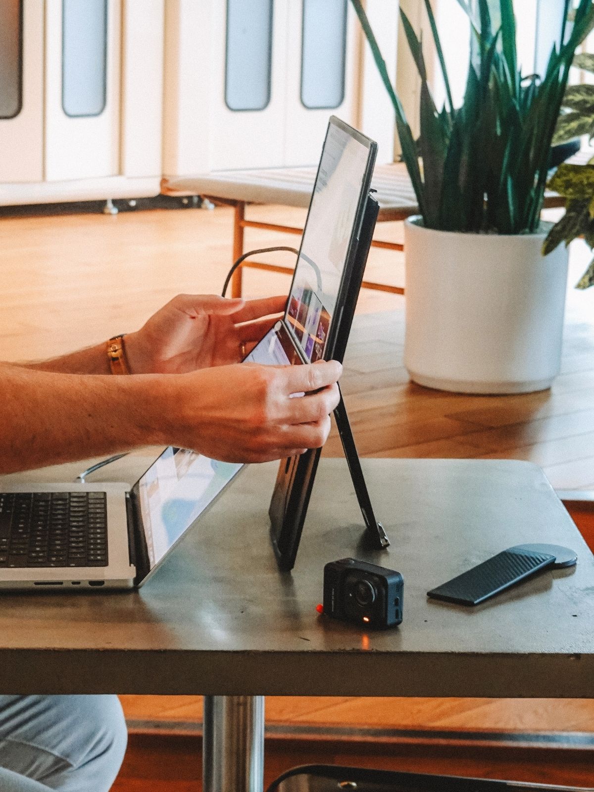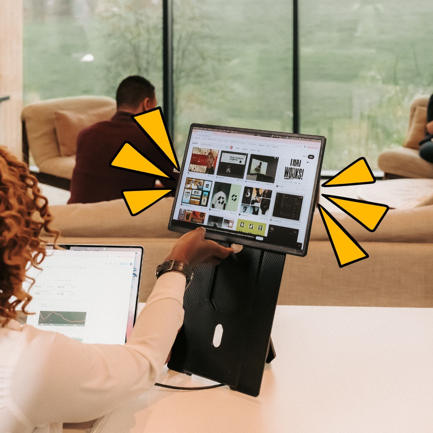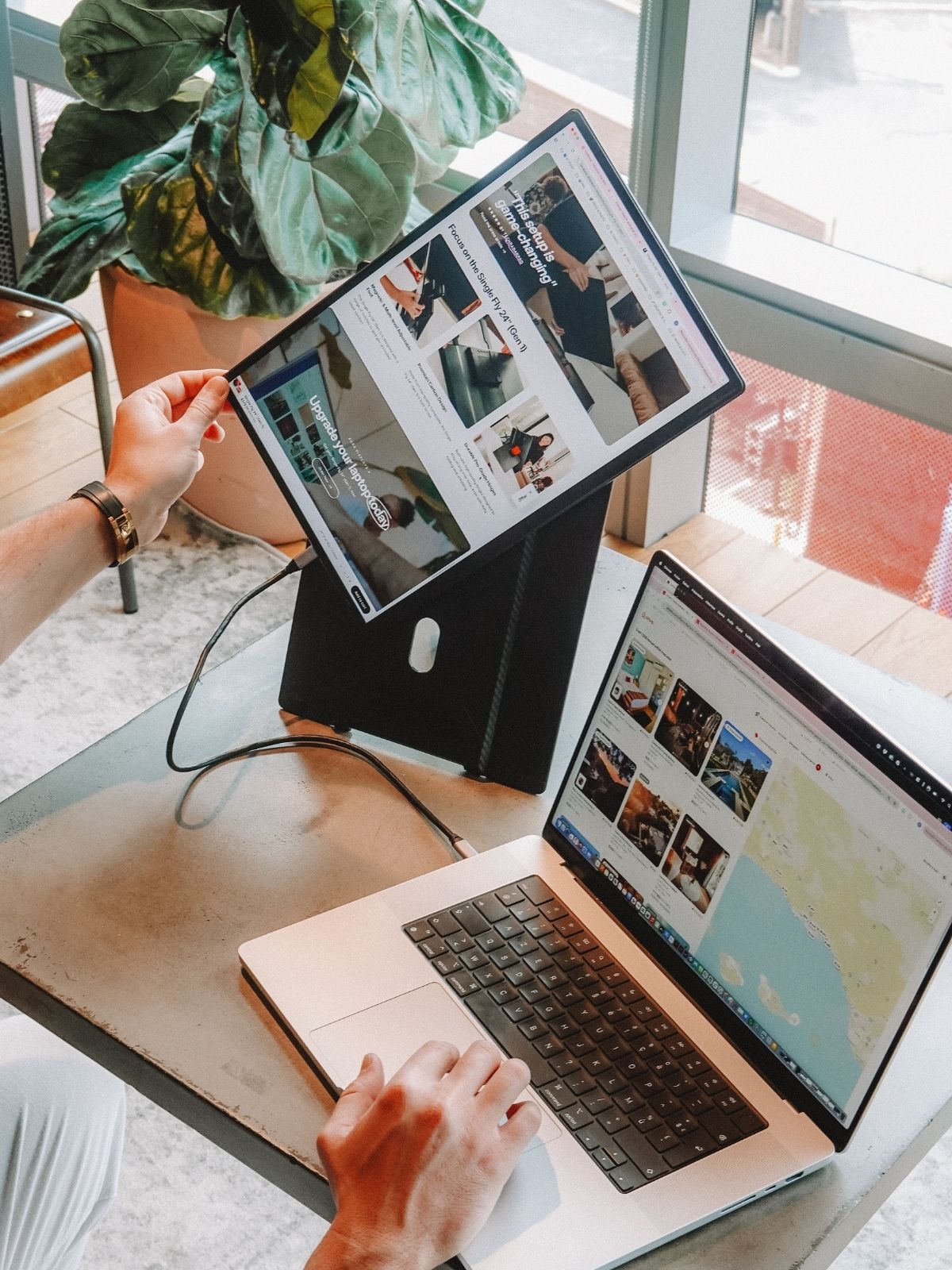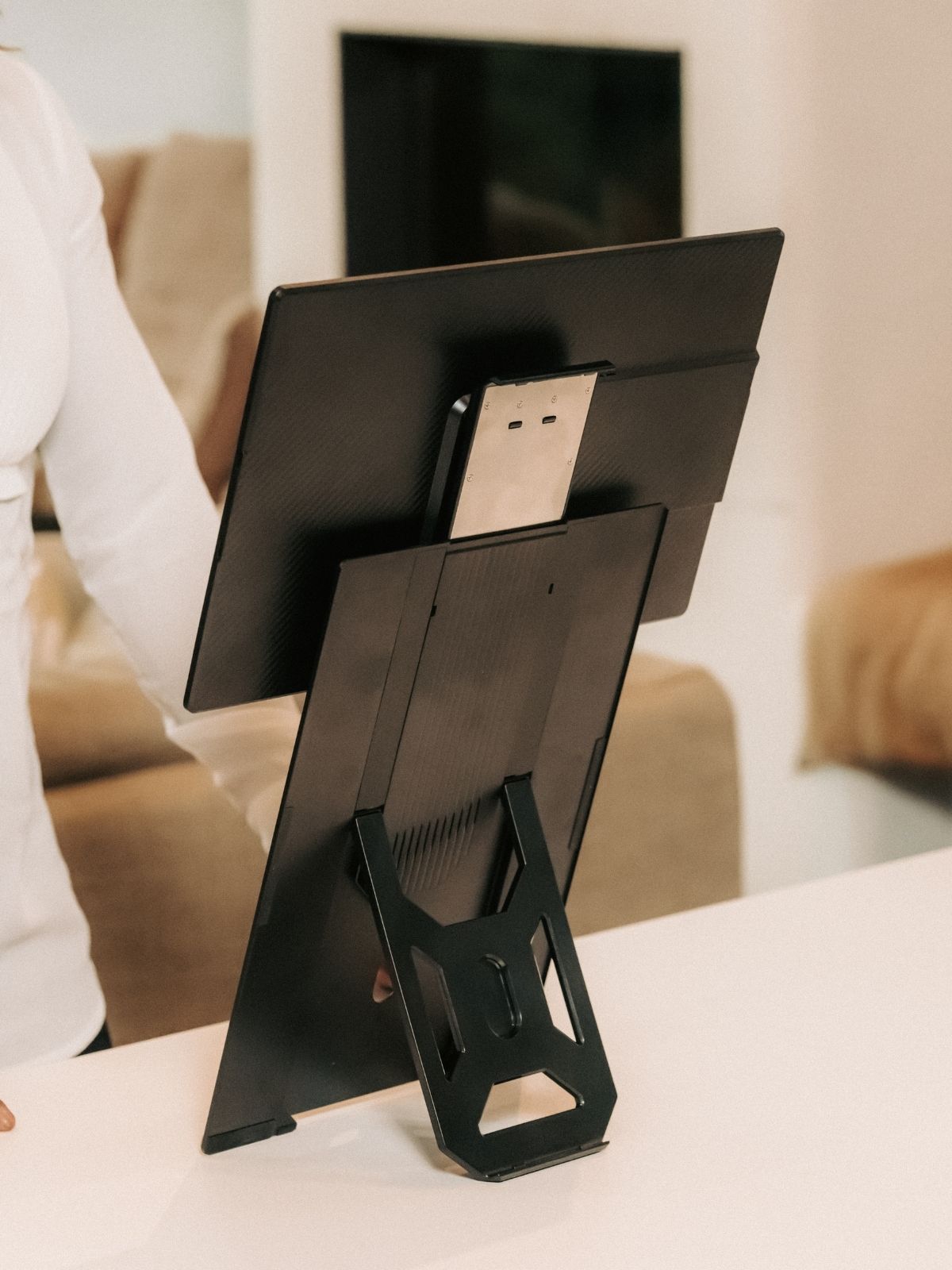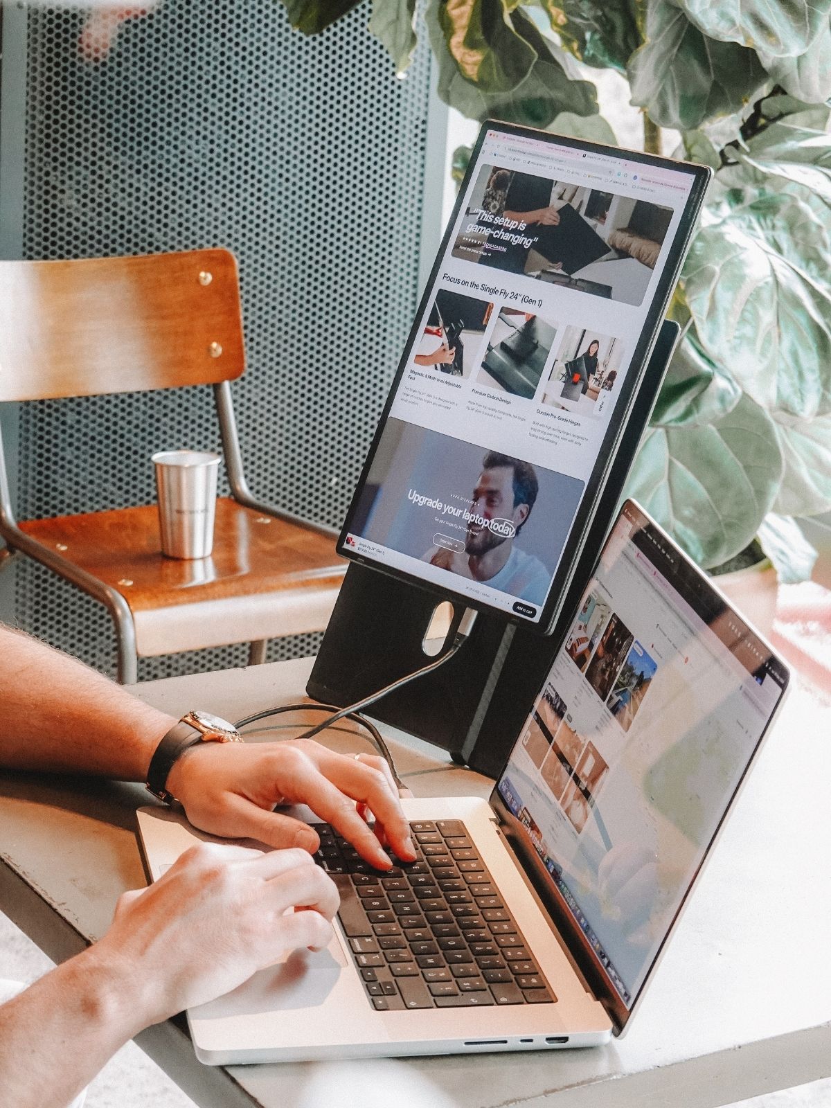 Introducing the Single Fly, the elevated portable monitor engineered for true desktop experience. Despite its expansive size, it is crafted to be impossibly lightweight and hyper slim, powered by a single, streamlined USB-C connection. The display seamlessly pivots from landscape to portrait mode, instantly optimizing it for any workflow. Its innovative design instantly and securely elevates the screen to eye-level. The Single Fly is the definitive solution for nomad professionals demanding a large portable screen for performance without compromise.